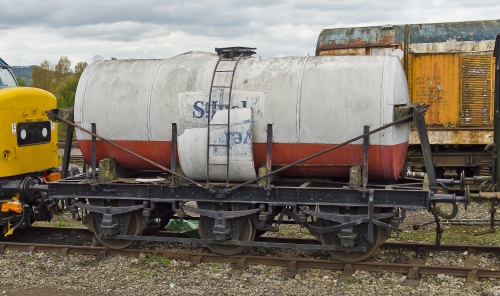 Built for United Dairies as end-manhole vehicle. Retanked with one from ex-LMS vehicle. Four additional webs on solebar. Has ex-LMS end stanchions in addition to the tie rods and ladder. In 'St Ivel' livery. |