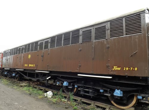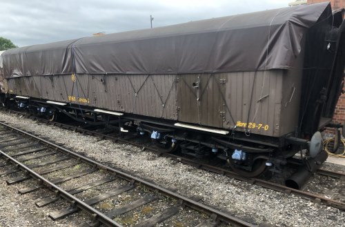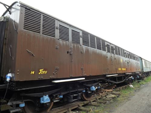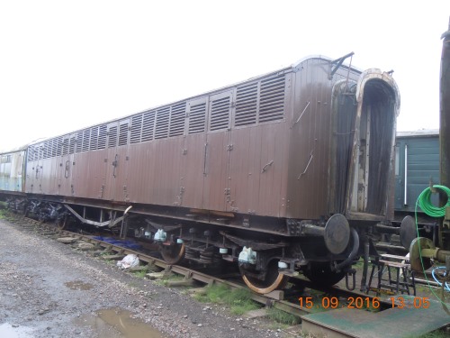 'Siphon G'. In US Ambulance Train No 69 as US6908 till 1946. P 1982 by Cotswold Steam Preservation. Steady restoration over last few years continues. By 05/15 all panels on 'other' side due to be replaced, with cleaning and repainting of the frames and bogies to follow. 09/16: at Winchcombe. 05/18: restoration virtually complete (see main photo and second additional one below); likely to move to Toddington soon to allow for changes to Winchcombe sidings. By 05/22: partially sheeted - see last additional photo below. |