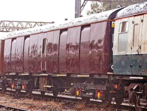 P c.2015 from DBC. c.05/17: stored at eastern side of Crewe LNWR Heritage Company site, visible from mainline - repainted in BR maroon livery; on B4 Bogies. 01/24: moved from Crewe to Peak Rail at Rowsley for storage. 05/25: confirmed still in situ. |