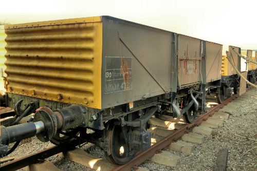 Originally built as a 5-plank 'High' (copy of the BR Highfit diagram 1/044). De-registered for main line working & TOPS plate removed 1981. Re-numbered AD 46283 for internal use only. Re-bodied by Marcroft at Stoke & Air Braked 1998-2003. For sale on March 2011 tender list. Arrived from MoD Marchwood 04/2011 |
