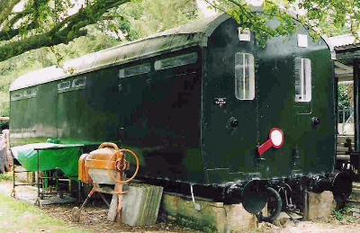 Six-wheel Thompson non-gangwayed passenger brake. Plated Stratford 1950. W 1977 - body acquired from BR by North London Society of Model Engineers and grounded at their London Colney site: café/store/kitchen. Guard's section complete and virtually as built. One end heavily modified, the other used as café/shop. Some external modifications to windows. 12/21: confirmed still in situ. |