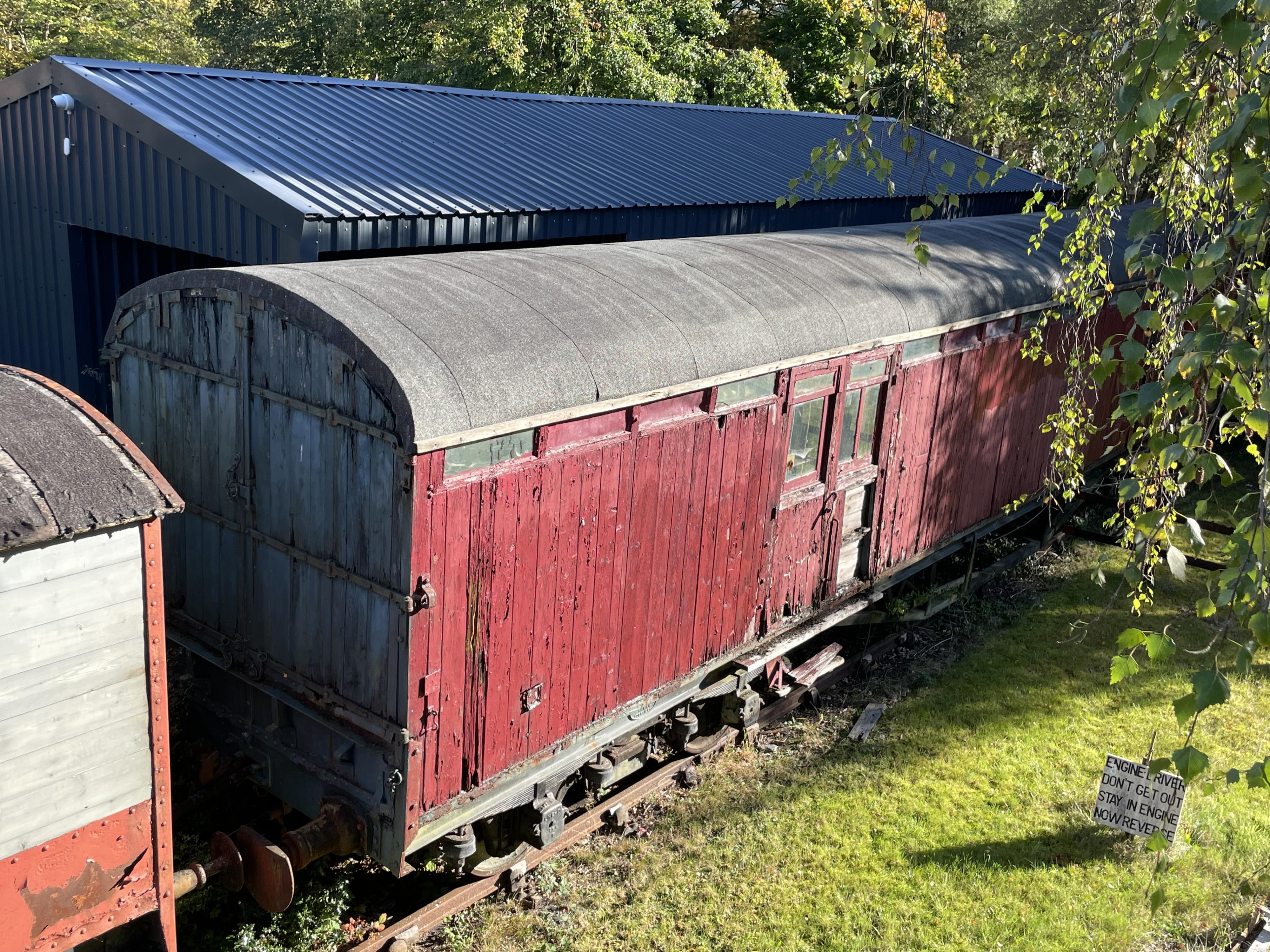 P ex York 1973 by Conwy Valley Railway Museum, Betws-y-Coed. In use as Workshop. Thought to be only surviving LNER-designed GUV. 08/07: has been repainted in BR crimson lake (but still grey on other side) and roof felt-covered. |