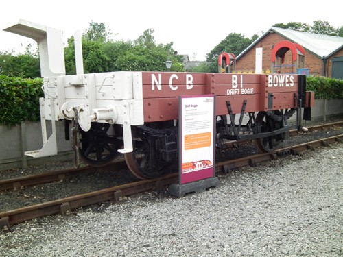 Ex Kibblesworth Drift. Severely damaged by fire in 2008, rebuilt at Stanegate Restorations 2009-2010. On loan from Bowes Railway for Railfest 2012. This was used to shunt the sidings at Kibblesworth Drift. The 'Drift' was on a slope and therefore could be shunted by a rope. Fitted with a platform for the shunter to ride on at one side of the front rope end, and a gong mechanism worked off the wheel at the other side. This wagon was loaded with scrap to increase its weight to enable it to run down to the sidings. |