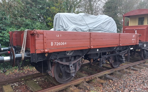 Vacuum fitted. Converted by RNAD to 4-plank Flatbed Wagon. Acquired from RNAD Bedenham 1994. Rebuilt by Mid-Hants to 2-plank Open. |