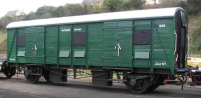 P 1995 by Vale of Glamorgan Railway Society (ex Allied Steel & Wire), at Cardiff Bute Road until 1997. Used as Stores. Interior has some graffiti but is undamaged. Repainted to SR Dark Green by 04/05. To Spa Valley Railway 08/09. By 09/21: fully refurbished for use as a buffet at Eridge station - repainted in BR crimson lake livery. |
